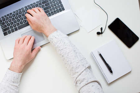 Hands on lapton, working time. Work concept. Laptop, smartphone and lapel microphone on a white background