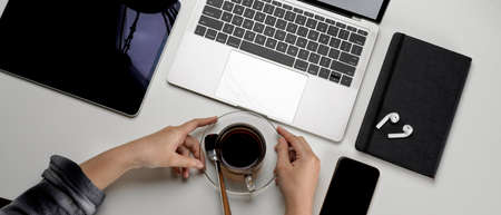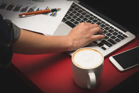 Top view of a business woman's hands typing on laptop with smart phone , headphone and coffee cup on wooden table in office