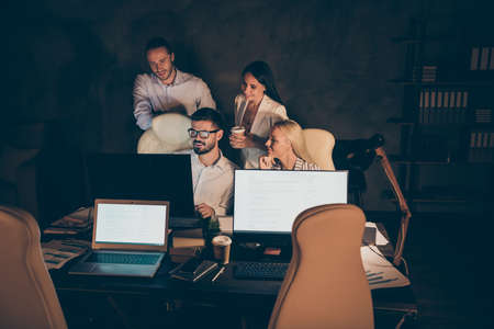 Nice attractive cheerful skilled experienced hardworking coworkers partners leaders experts specialists creating new launch startup at night at work place station dark room indoors