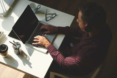 Cropped shot of male freelancer working on his project while collecting ideas from notebook in comfortable workspace