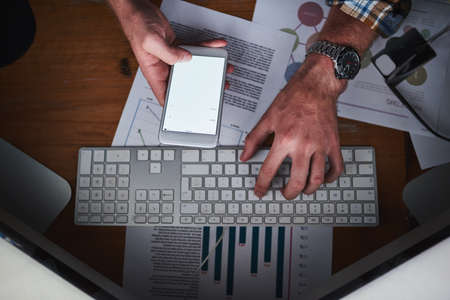 Hands on a computer keyboard and typing on a phone in an office with paper work from above. Closeup of a business man browsing the internet, finishing a report or sending a communication email