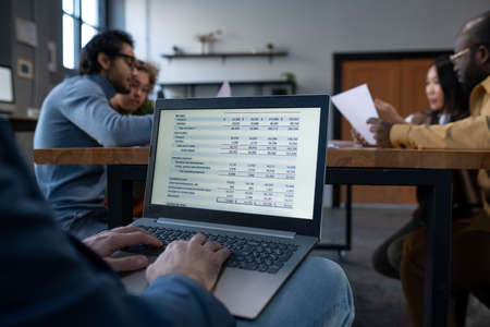 Hands of mature businessman tying on laptop keyboard while preparing financial report or presentation for young coworkers