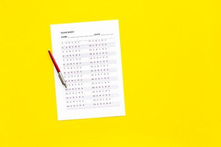 Exam sheet on yellow table flat lay copy space. Education concept.