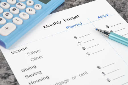 A print out of a monthly budget for your text with pen and calculator on wooden background.