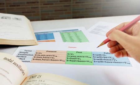English exercise on table with pencils in class under summer light