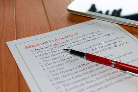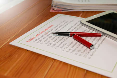 Subject and Verb Agreement worksheet on wooden table in class