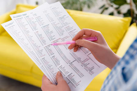 Cropped view of woman with pen holding allergy test results