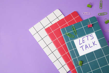 Notebooks with text LET'S TALK and paper clips on color background