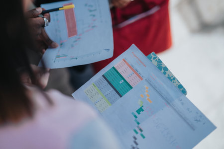 Team members analyzing project timeliness and data on printed spreadsheets at work