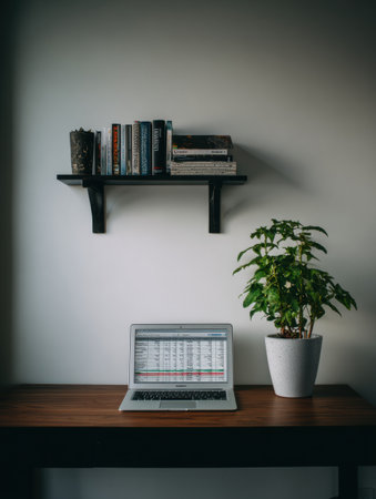 A modern desk arrangement featuring a laptop displaying data, a potted plant, and a shelf with books, creating a chic, organized workspace atmosphere.