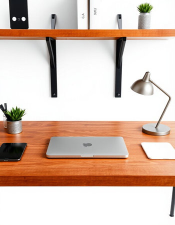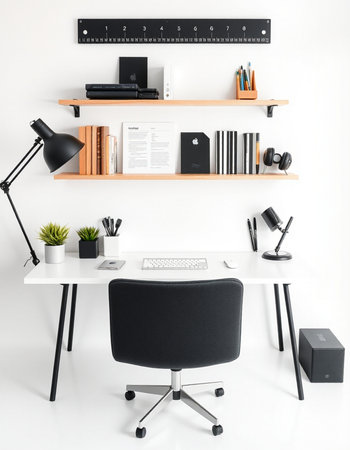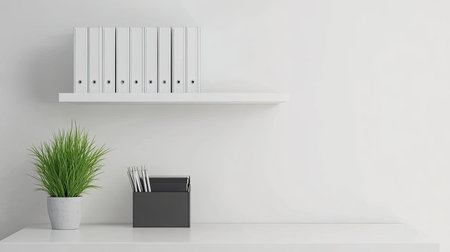 A contemporary office desk featuring a sleek white surface, organized binders on a shelf, a vibrant green plant, and stylish stationery. Ideal for inspiration.