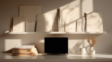 A serene office desk scene featuring a laptop, neatly arranged folders, and soft natural light casting shadows, embodying minimalism and organization.