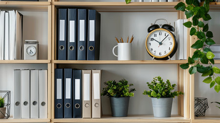 A stylish modern office shelving unit featuring neatly arranged binders, a decorative plant, and organized stationery. Ideal for a productive workspace.