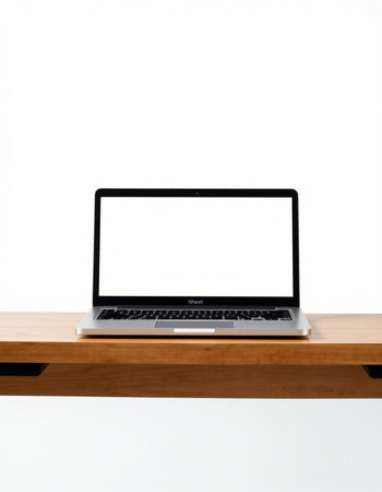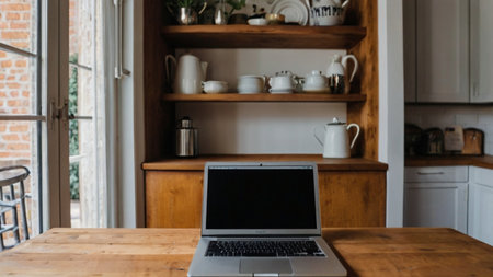 Open laptop with blank screen on a wooden desk in a kitchen room home office