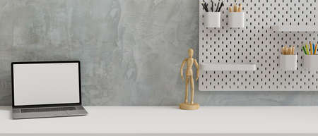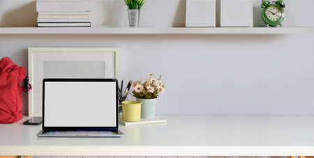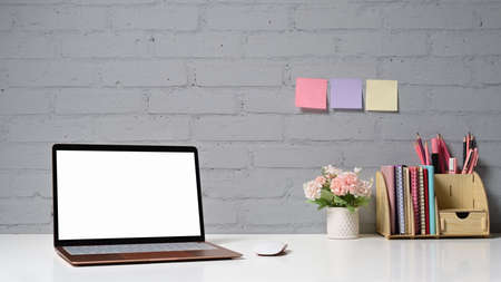 Simple white workplace with open blank screen laptop and office supplies with white brick wall background