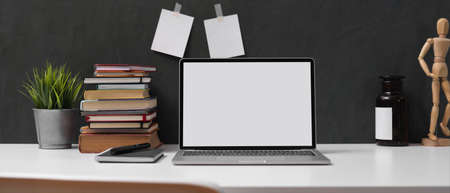 Close up view of study table with mock up laptop, stack of books, notepad and decorations on white table