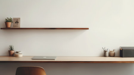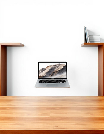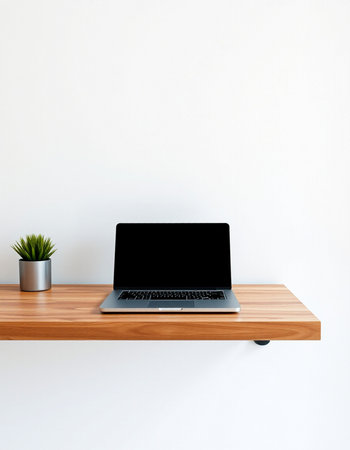 Laptop on a wooden shelf against a white wall. 3d rendering