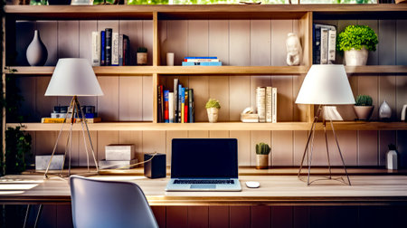 An interior shot features a wooden home office with shelves filled with books and various objects. A laptop sits on a desk, possibly indicating work or study. The scene is illuminated by daylight, creating a bright and airy atmosphere. Suitable for use in articles on home offices, interior design, or lifestyle content.