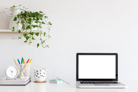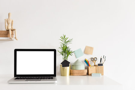 Modern workspace with blank screen laptop, stationery and plant on white table