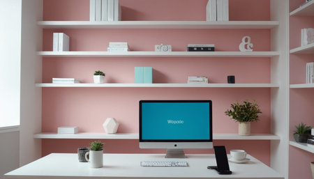 White office desk with a laptop a cup of coffee in the morning with a pink bookcase behind