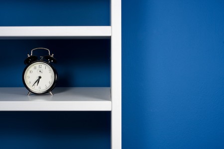 This image presents a well-lit interior scene featuring a navy blue bookcase, vintage books, and desk setup, ideal for editorial or advertising campaigns. It evokes a cozy, academic atmosphere.