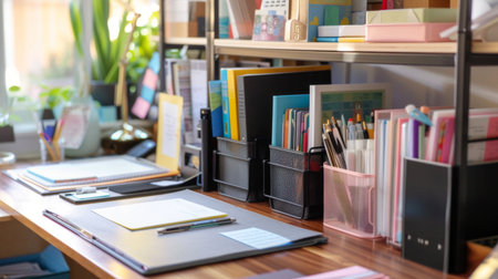 An organized desk with labeled storage bins and file organizers, emphasizing efficiency and orderliness.