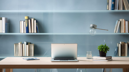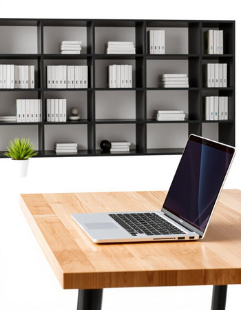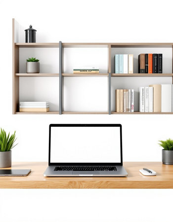 3d render of workspace with blank screen laptop, bookshelf and decorations.