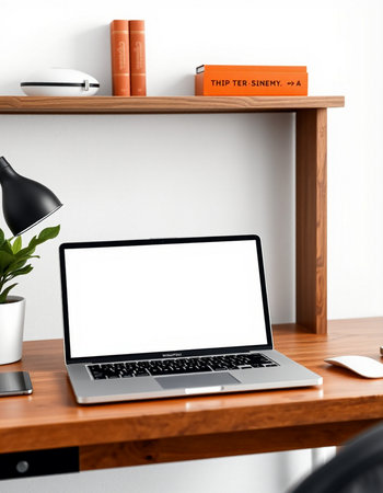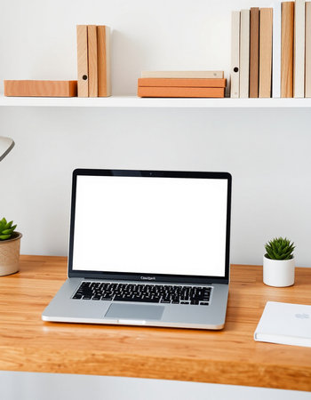 Laptop computer mockup at home office desk, supplies books and ivy on the shelf.