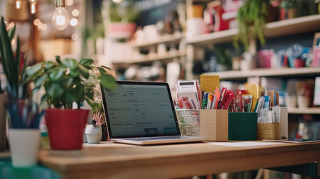 A vibrant workspace featuring a laptop, colorful stationery, and a lush plant, providing a cozy and inspiring environment for productivity and creativity.
