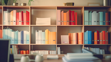 A shelf next to a wall is filled with neatly arranged files and binders. The files are labeled and organized according to a system. The binders are stacked in an orderly fashion, ready for easy access.