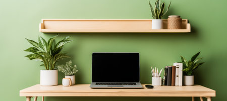 A neatly arranged workspace features a wooden desk with a laptop and various potted plants. Minimalistic decor enhances the green wall background, creating a calming atmosphere.
