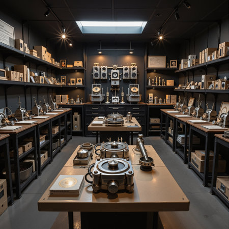 A warmly lit room displays an array of vintage scientific equipment neatly organized on shelves and tables. The walls are lined with shelves holding boxed items and various devices, creating a nostalgic atmosphere. Central tables display intricate apparatuses with metallic and wooden elements, suggesting precision engineering. Under focused lighting, a central setup is framed by symmetrical cabinets of instruments with dials and gauges. The design and layout emphasize functionality and aesthetics, portraying a blend of history and technology. Overall, the room reflects a timeless dedication to scientific exploration and discovery.