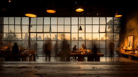 Motion blur captures the dynamic atmosphere in a bustling co-working space filled with professionals and entrepreneurs