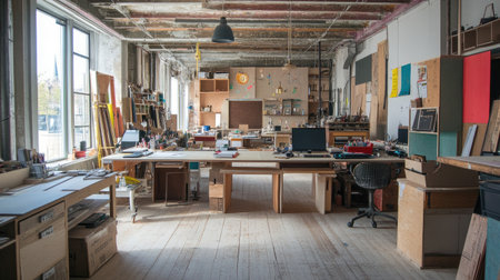 An authentic view of an artisan workshop, featuring a cluttered workbench filled with various tools, brushes, and materials, illuminated by warm light, highlighting creativity and craftsmanship.