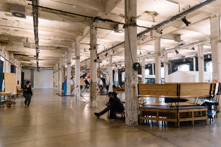 Post-Digital Craft Workshop Former manufacturing facility featuring hand-craftsmanship stations along perimeter walls highlighting renewal of traditional techniques enhanced by digital