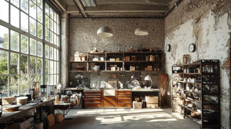 Bright and inviting artisanal workshop featuring exposed brick walls, wooden shelves filled with craft supplies, and a cozy atmosphere perfect for creativity.