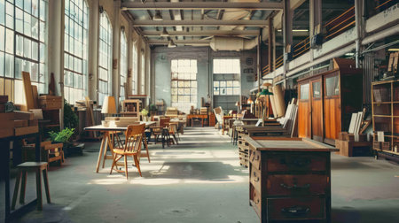 Artisans engage in woodworking tasks inside a spacious workshop, surrounded by tools, materials, and sunlight streaming through large windows.