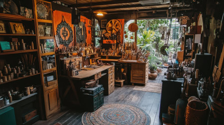 A serene artisan workshop showcases an array of handmade crafts and wooden tools, creating an inspiring space surrounded by nature's beauty and vibrant decor.