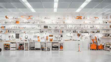 Efficient and tidy automotive workshop displays well-organized tools machinery and workstations designed for high productivity and vehicle servicing activities.