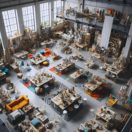 High-ceiling workshop space in a factory with large worktables, storage racks, and industrial tools, showcasing a productive environment