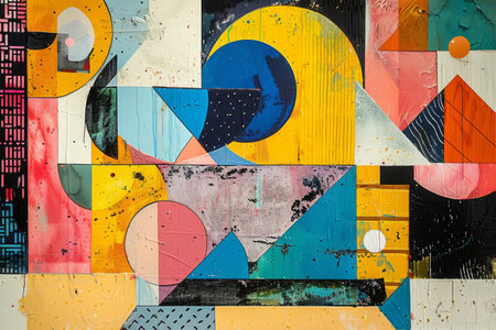 Abstract geometric background with bold shapes, vibrant colors, and textured layers. The artistic, dynamic design adds a sense of creativity and modernity, ideal for innovative themes