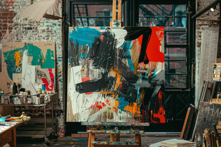 A large canvas propped up on an easel, covered in bold, abstract strokes AI generated
