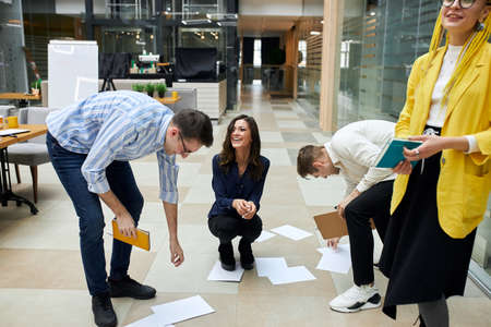 Teamwork and cooperation. Multiethnic business company workers collect sheets of paper from the floor at modern office.