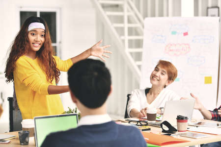 Creative agency meeting - group of business people in casual wear talking during conference at office and applauding during speech.