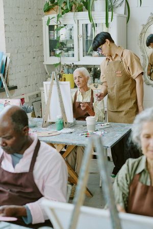 Vertical shot of young adult drawing teacher checking her senior student who trying to study new drawing technique in background