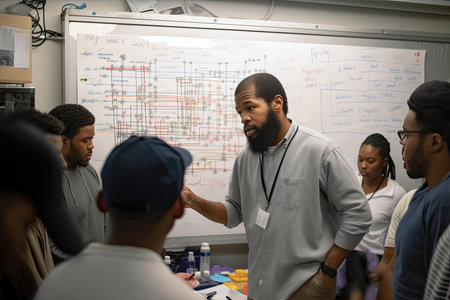 a man standing in front of a whiteboard with several people around him and pointing to it on the wall. Generative Ai
