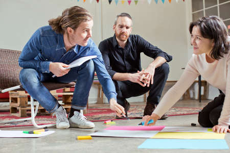 Creative asian team working on new startup project sitting on floor.