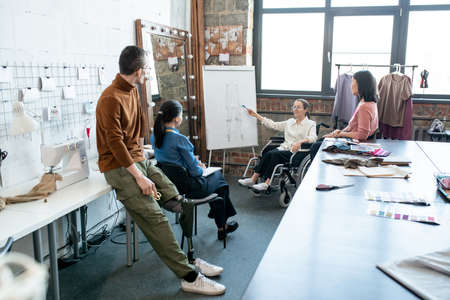 Contemporary designers looking at whiteboard while their colleague making presentation