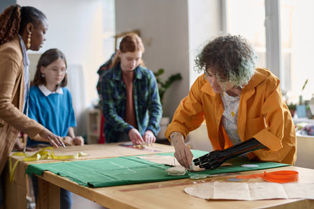 Portrait of young woman with prosthetic arm making clothing patterns in sewing class copy space