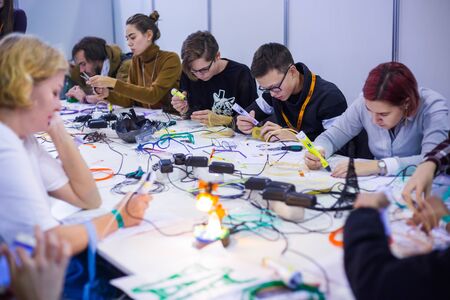 MOSCOW, RUSSIA - OCTOBER 12, 2018: 3D Print Expo - Group of people using 3D printing pens and making plastic models at technology exhibition Future and technology concept